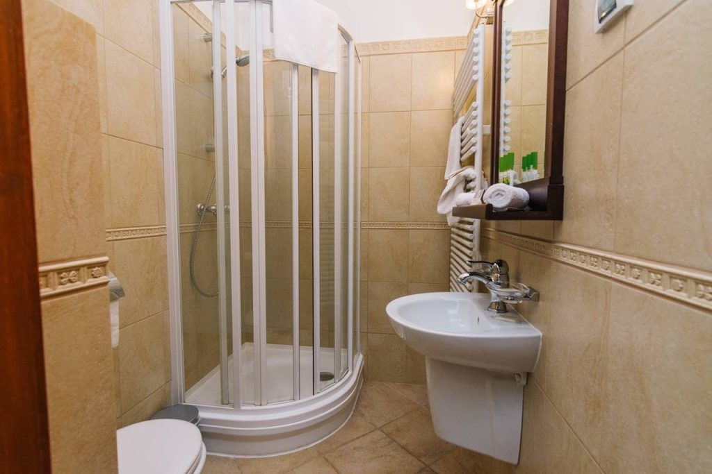 Kád vagy zuhanyzó, fürdőköpeny, papucs, hajszárító és piperecikkek várják vendégeinket